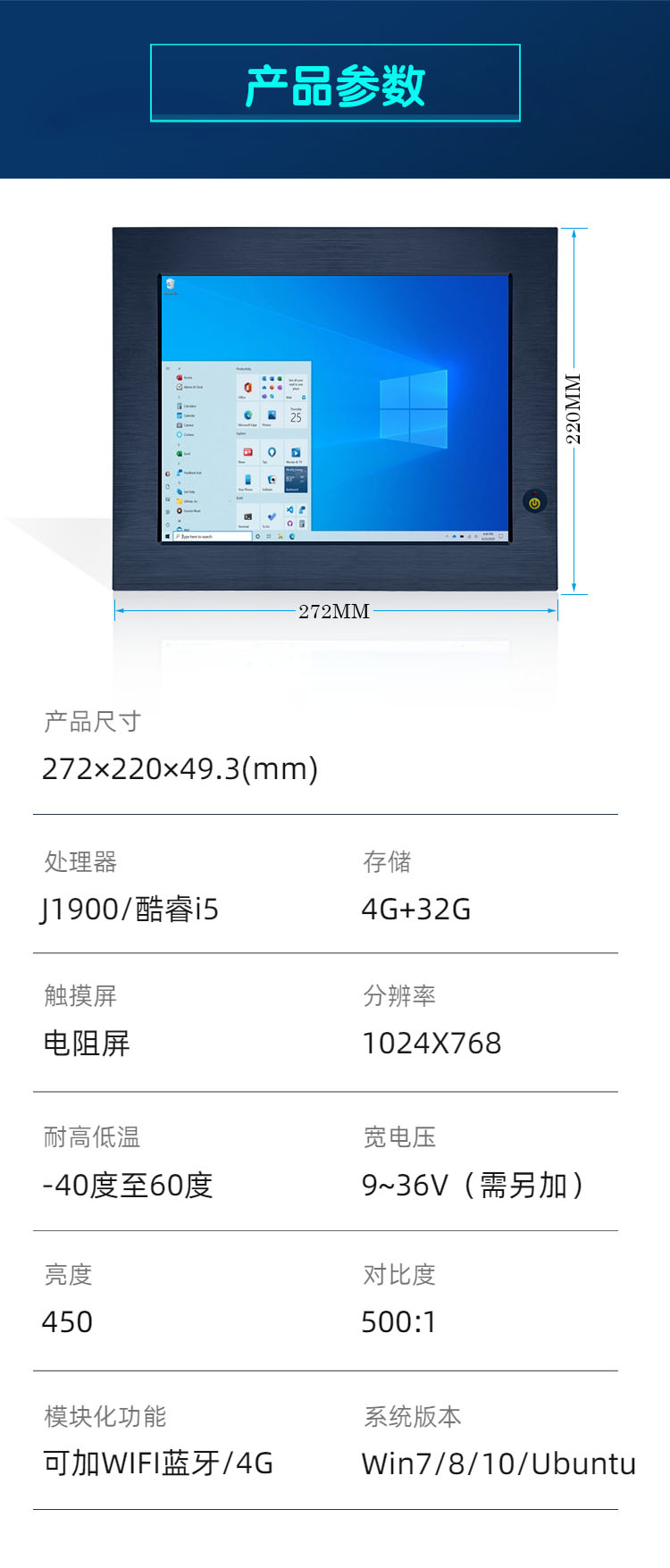 3. 电脑供电:12V,出厂配有12V/5A 电源适配器 (可免费加宽压模块,支持9-36V供电)。