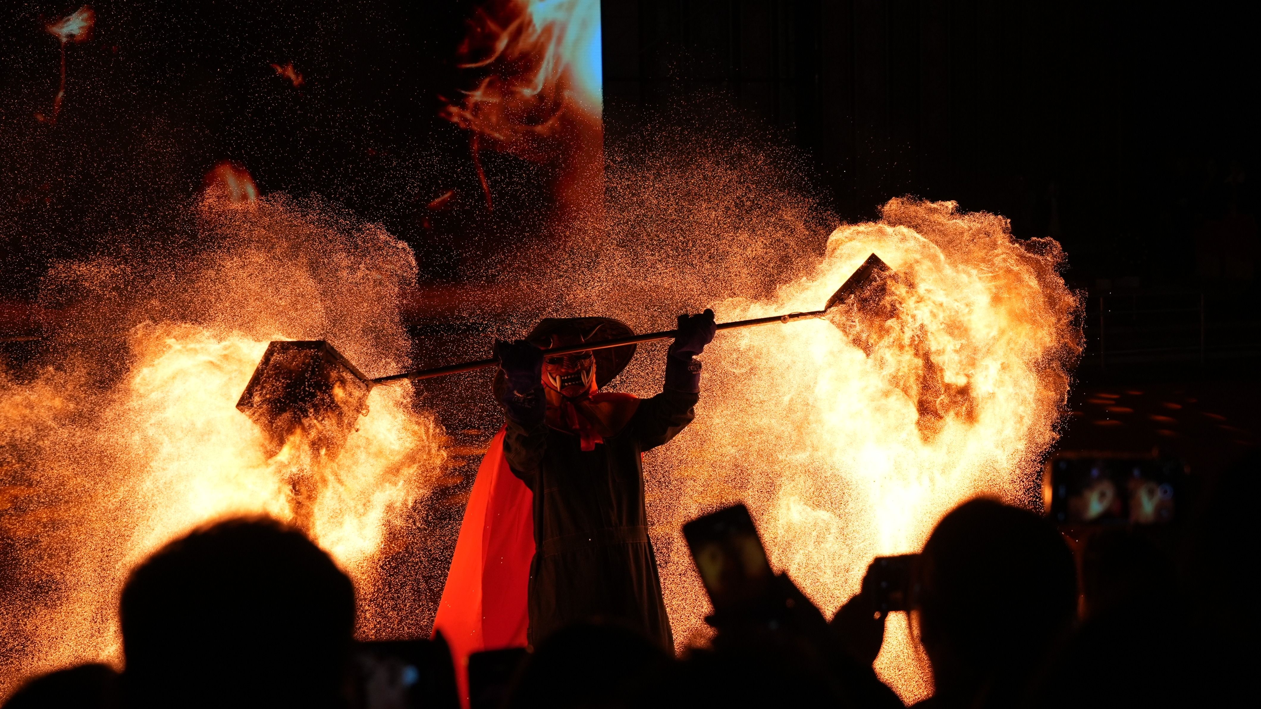 夜色渐深,非遗“火系列”表演惊艳登场,瞬间点燃了全场的热情。掌握多种非遗技艺的表演者王雄亮身着特制护具,沉稳托起四十斤重的火壶——抖、转、抛、接一气呵成,壶中800℃的炽炭凌空泼洒,化作万千飞溅的星火。