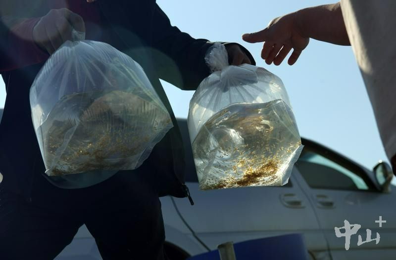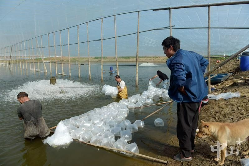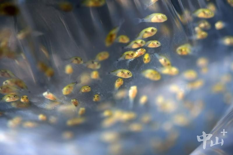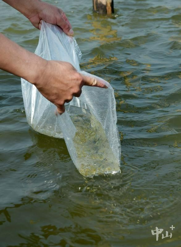 一个月左右的河鲀鱼鱼苗装在袋子里准备放养。记者 明剑 摄