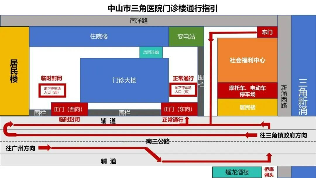 1月9日,中山市三角医院发布提醒:因中山市三角医院周边区域围蔽施工需要,为保障施工期间人员安全及交通秩序,中山市三角医院正门(西向)出入口及地下停车场(西向)出入口临时封闭,禁止所有车辆及行人通行。