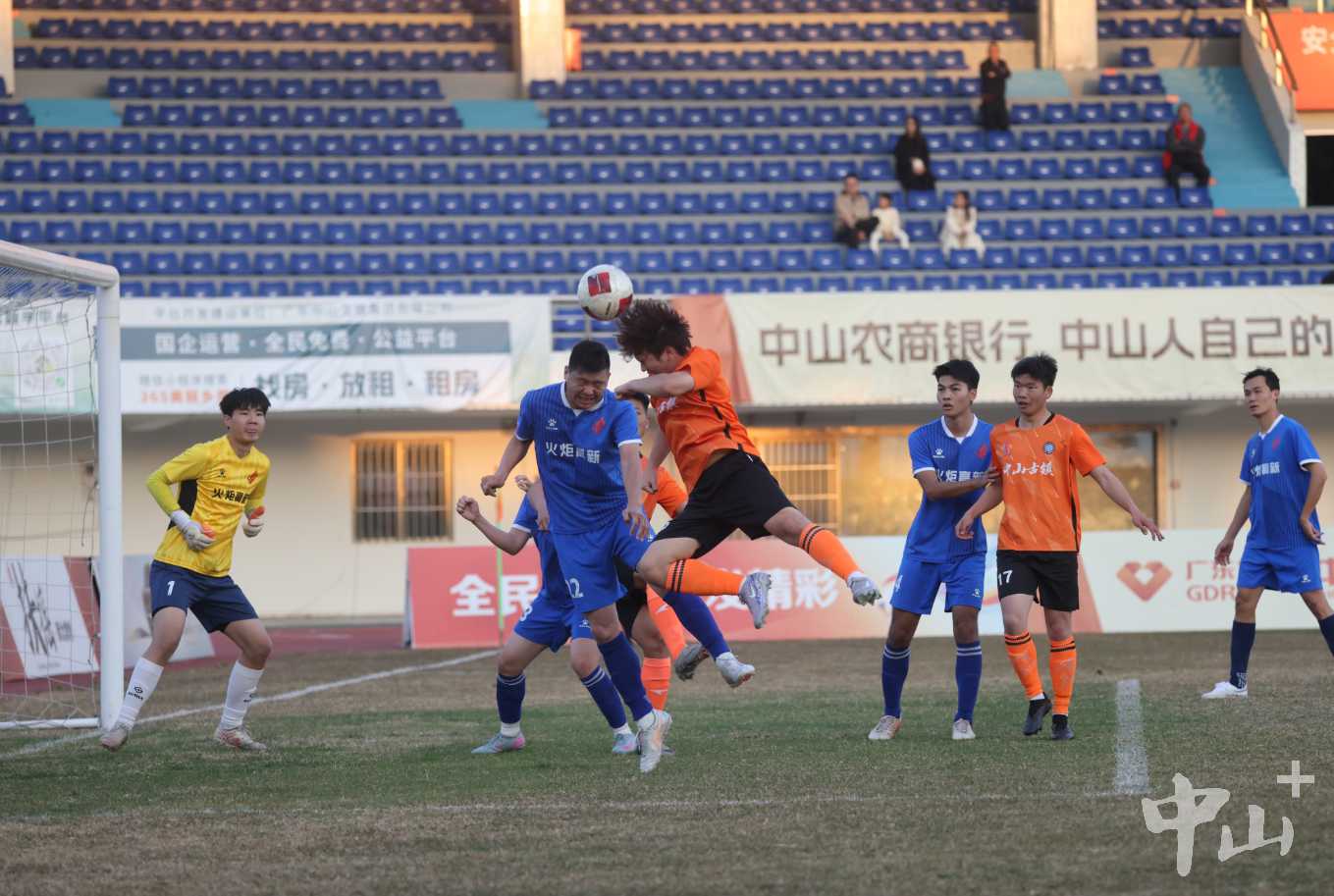 1月11日,“中山镇超”比赛现场,古镇灯饰队(橙衣)迎战火炬高新队(蓝衣)。梁敬贤 摄