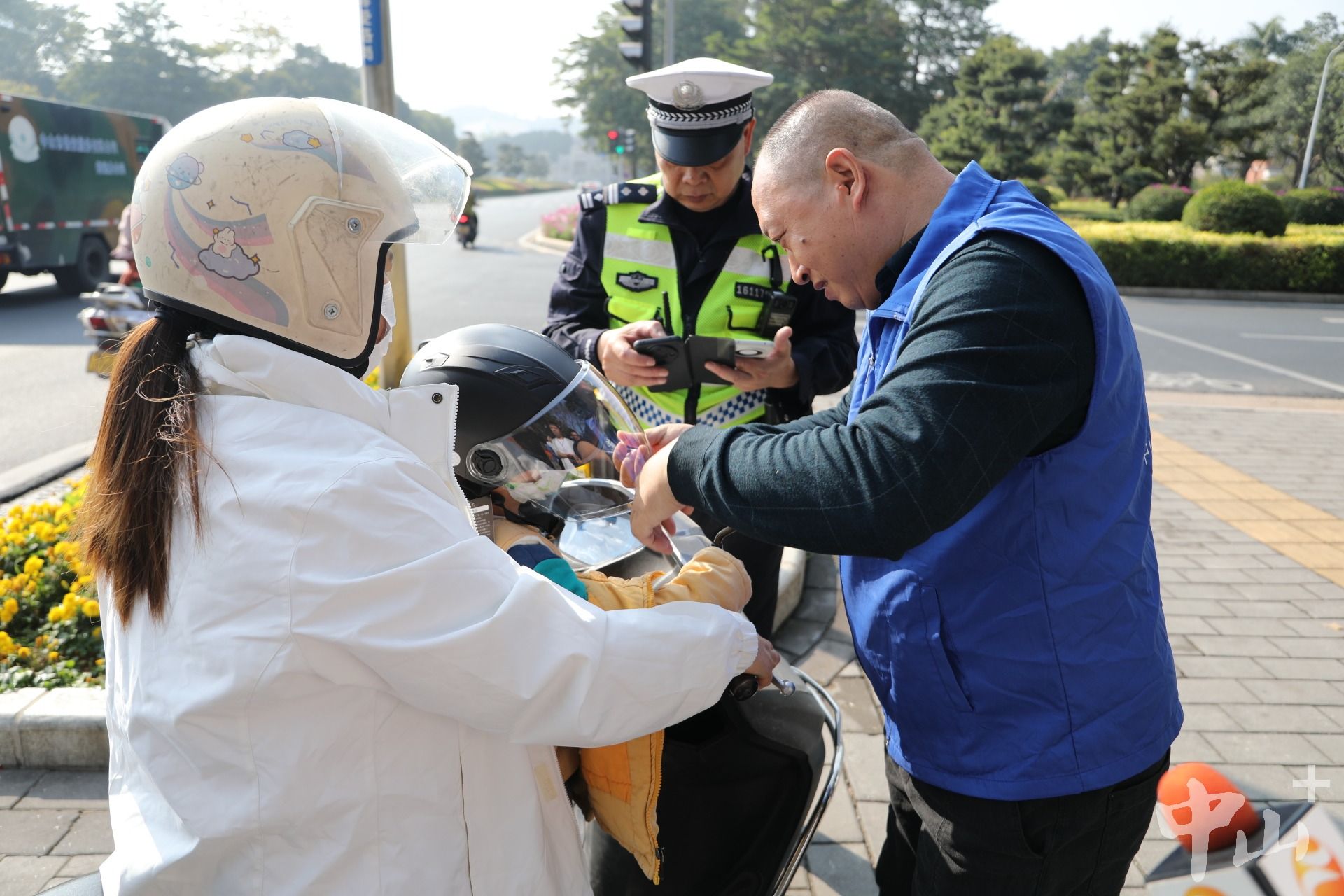 在严管严查的同时,中山志愿者深度参与交通违法劝导和宣传教育等专项行动。记者 王云 摄