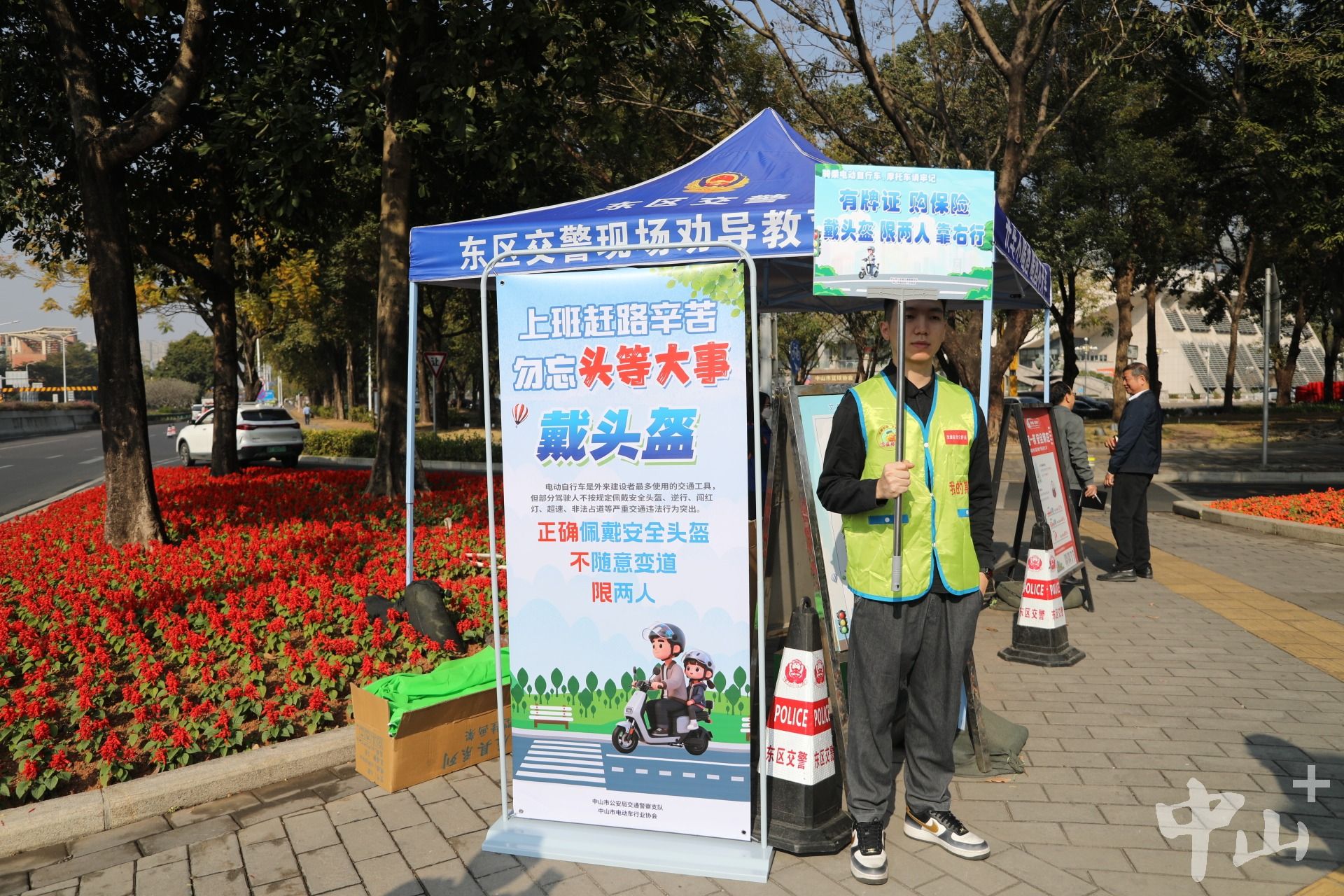 中山“佩戴头盔”宣传随处可见。记者 王云 摄