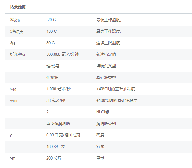 LOAD1000(L223V)基础油类型:矿物油,40°C时基础油粘度1000mm^2/s ,100°C 时的基础油粘度38mm^2/s ,工作温度范围-20 +130°C ,持续工作温度极限80°C ,增稠剂类型:锂/钙皂,粘稠度(NLGI 等级)3,密度0,93kg/dm^3,专用油脂用于球轴承和滚子轴承,应用于矿山机械,建筑机械,特别适合用于承受大冲击载荷的大型轴承,适用于非常高的载荷,中等温度和低转速。 相关搜索《《润滑脂发货实录,安徽捷越FAG ARCANOL润滑脂发货实录,润滑脂TEMP90发货实录