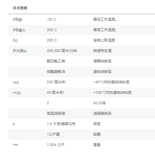 TEMP200(L79V):基础油类型:Alkoxyfluoro 油,工作温度范围-30 +260°C ,持续工作温度极限200°C,增稠剂类型:PTFE,粘稠度(NLGI等级)2,专用润滑脂用于球轴承和滚子轴承,应用于极高温度环境下的特种润滑脂高载工况下的高温工作环境回转窑的支撑滚轮或者压缩机的转子,防化学腐浊的工况。