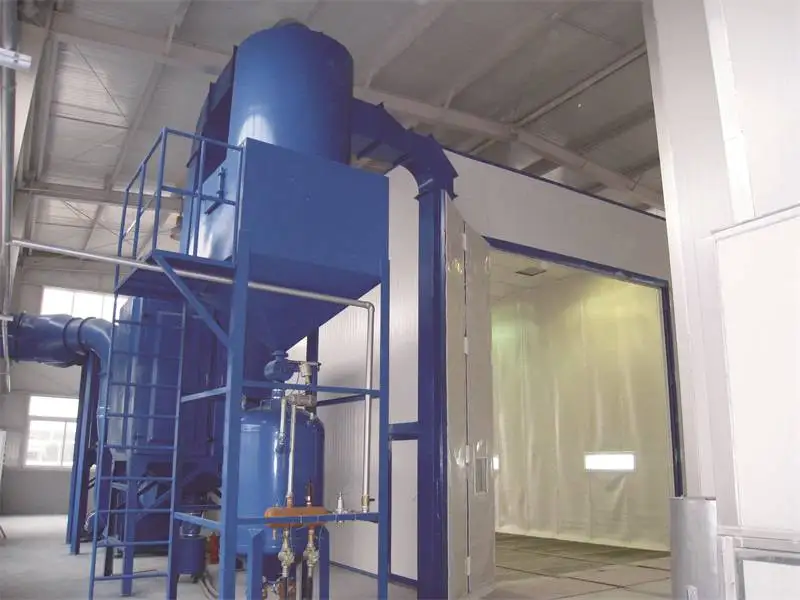 机械回收型喷砂房主要包括方体部分,漏斗格栅,丸料循环回收系统(包括皮带输送机或螺旋输送器,提升机,分离器,储料仓,回转加料阀),除尘系统,承载系统,照明系统,电器控制系统,三维升降平台等。